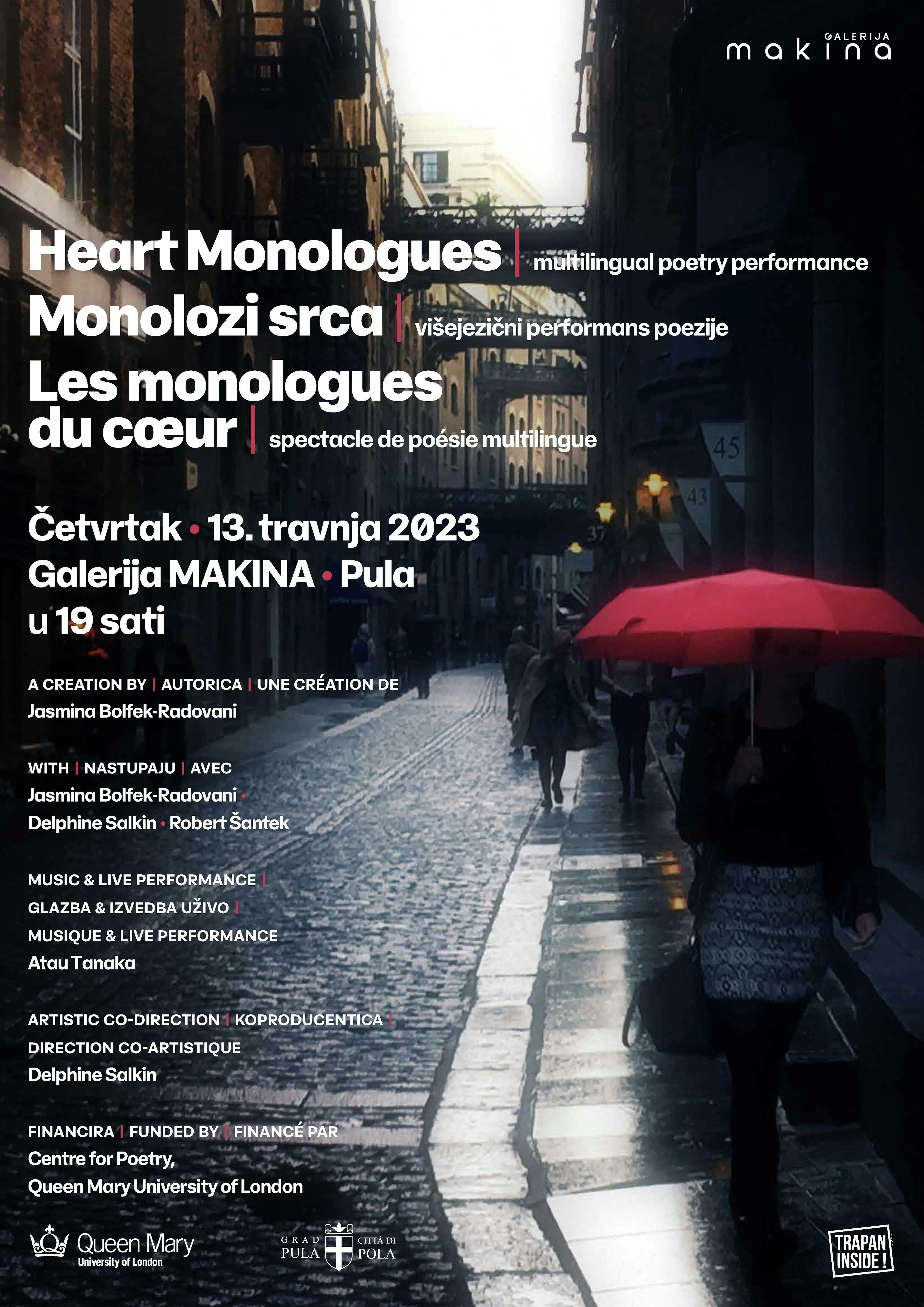 Premijera “Heart monologues” održana je u okviru festivala The World in Westminster festival, 15-17. ožujak 2022, Westminster University, London, dok je druga izvedba održana u Parizu, 21.veljača 2023, Delaville café, u sklopu serije bilingvalnih večeri eksperimentalne poezije koje svake godine organizira Ivy Writers Paris. Poslušajte kratki isječak performansa na Youtubu.